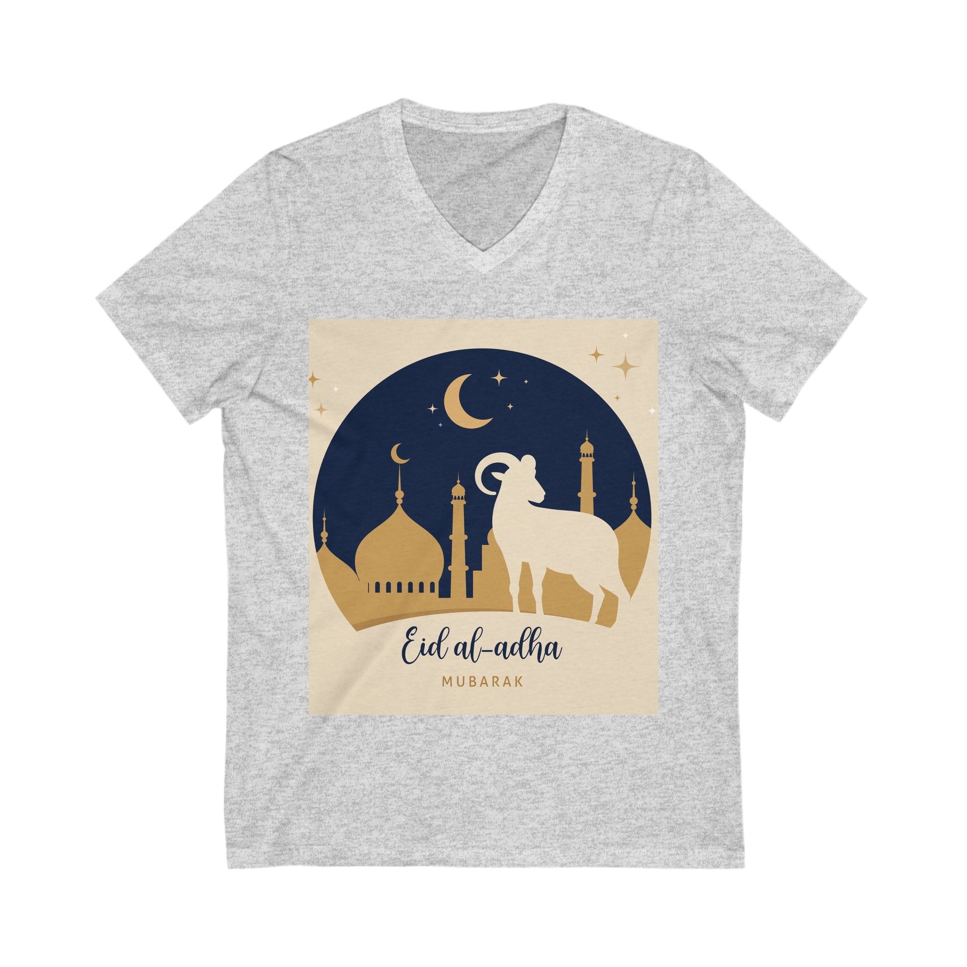 Celebrate the spirit of Eid al-Adha with this elegant unisex V-neck tee. Featuring a peaceful desert night design with crescent moon and ram, this shirt is perfect for marking the blessed occasion with style and comfort.