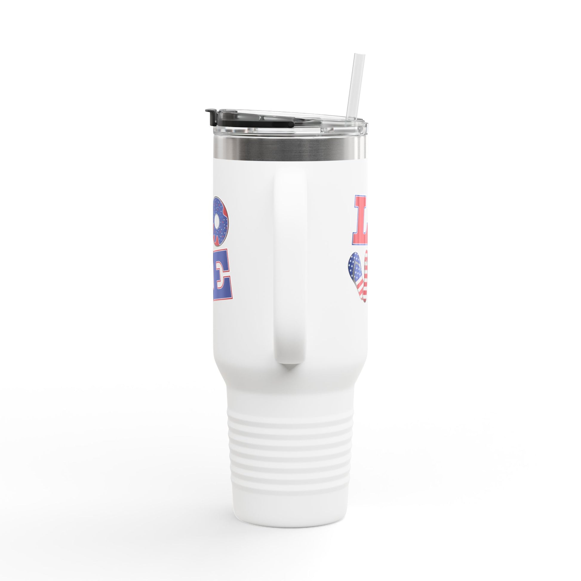 Show your love for your country while staying refreshed on the go with this Patriotic Insulated Travel Mug. Featuring a bold red, white, and blue “LOVE” design with a heart-shaped American flag detail, this 40oz tumbler is perfect for keeping your drinks hot or cold for hours.